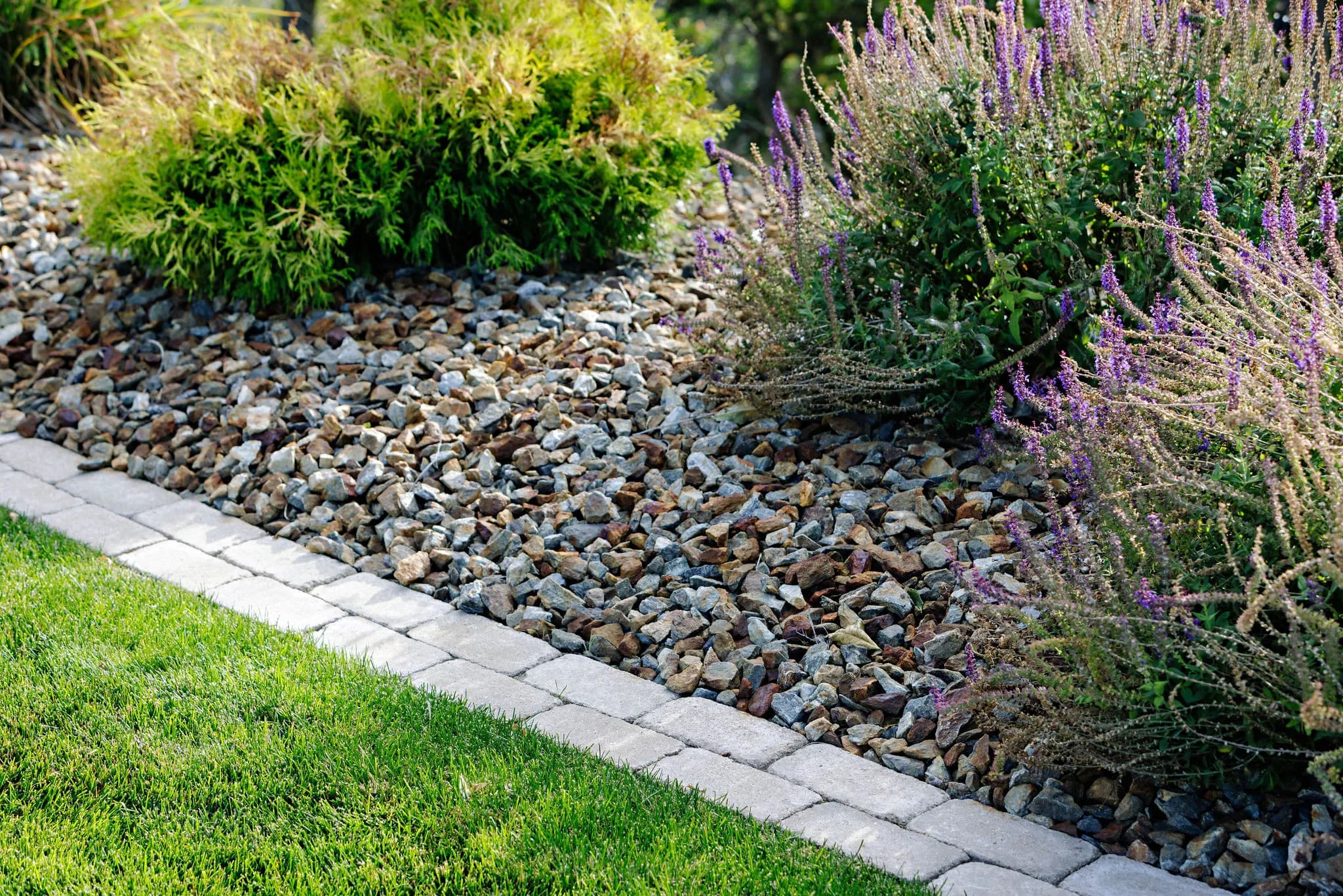 Mulch and decorative rocks are applied to conserve moisture and add visual appeal. These materials help suppress weeds, improve soil health, and create a tidy, aesthetically pleasing landscape.